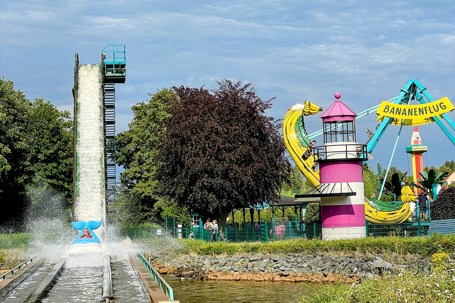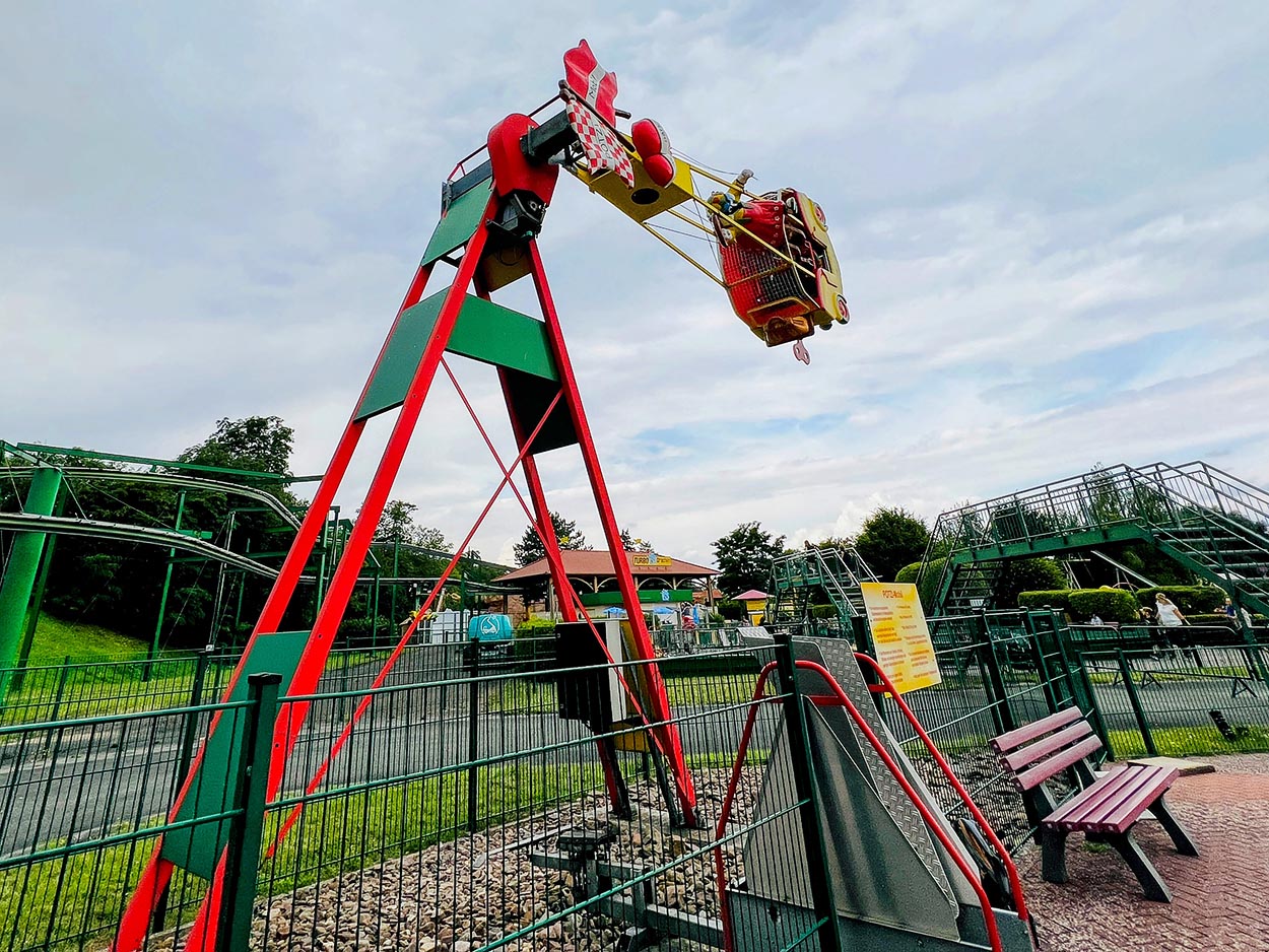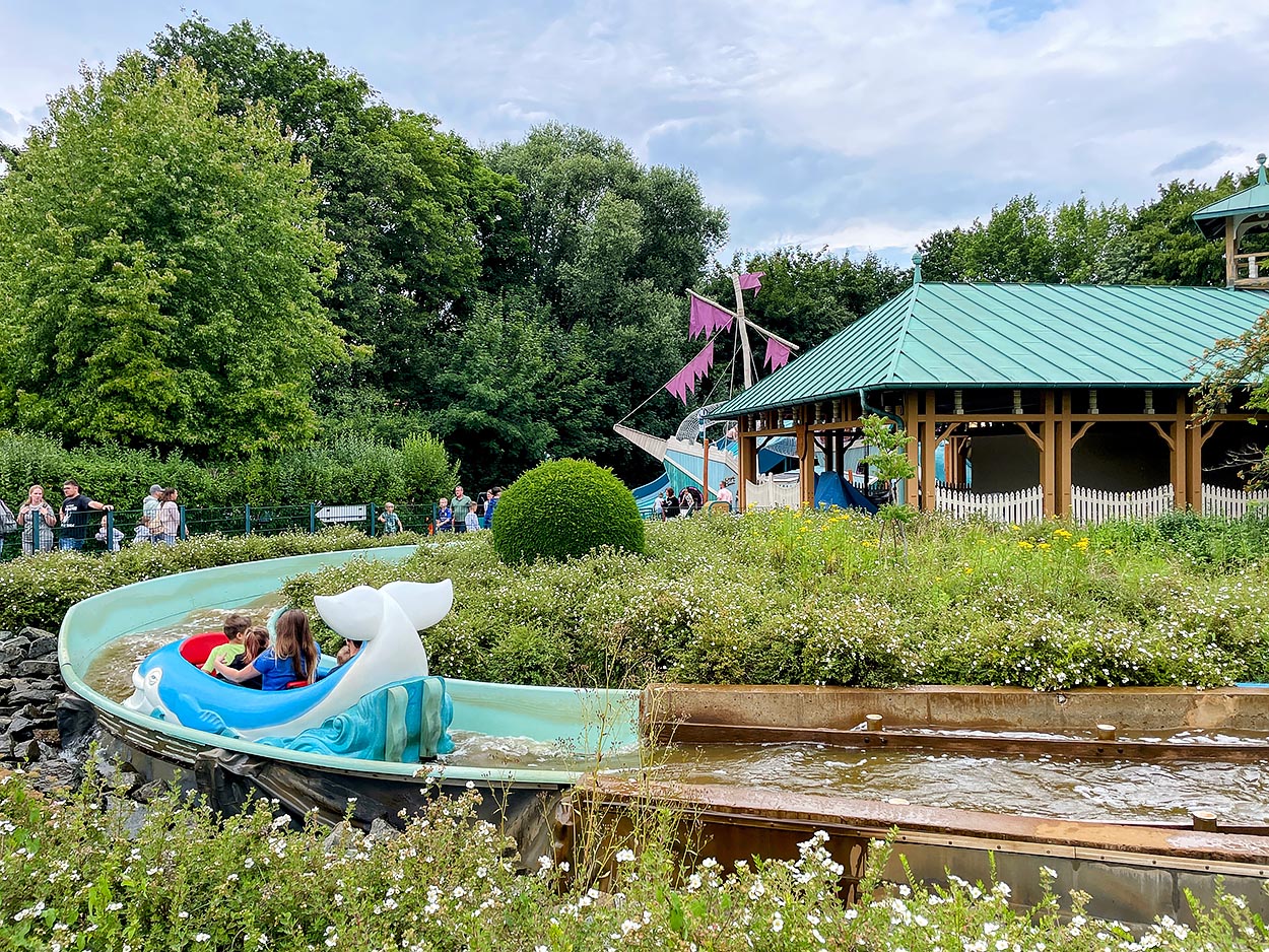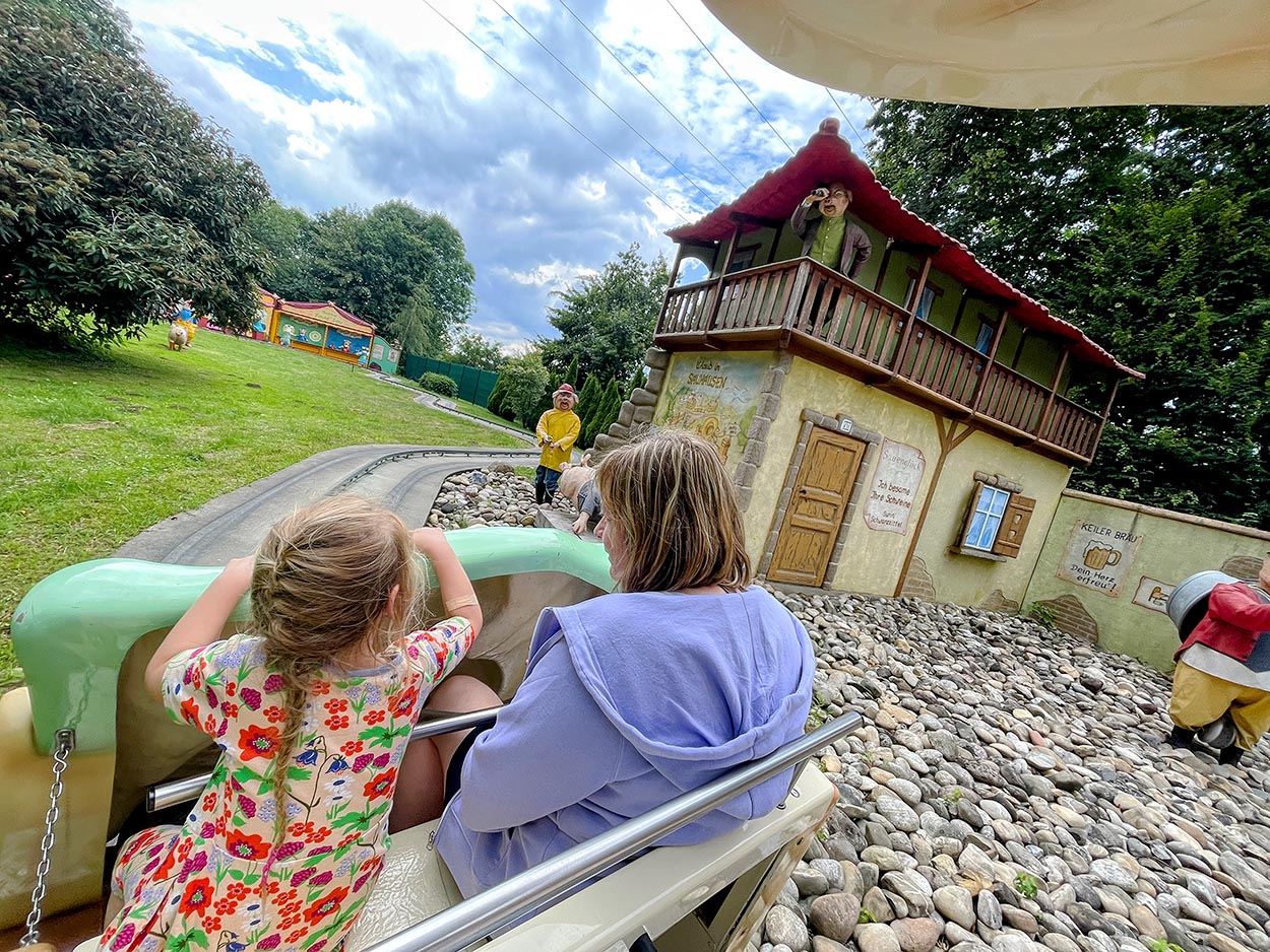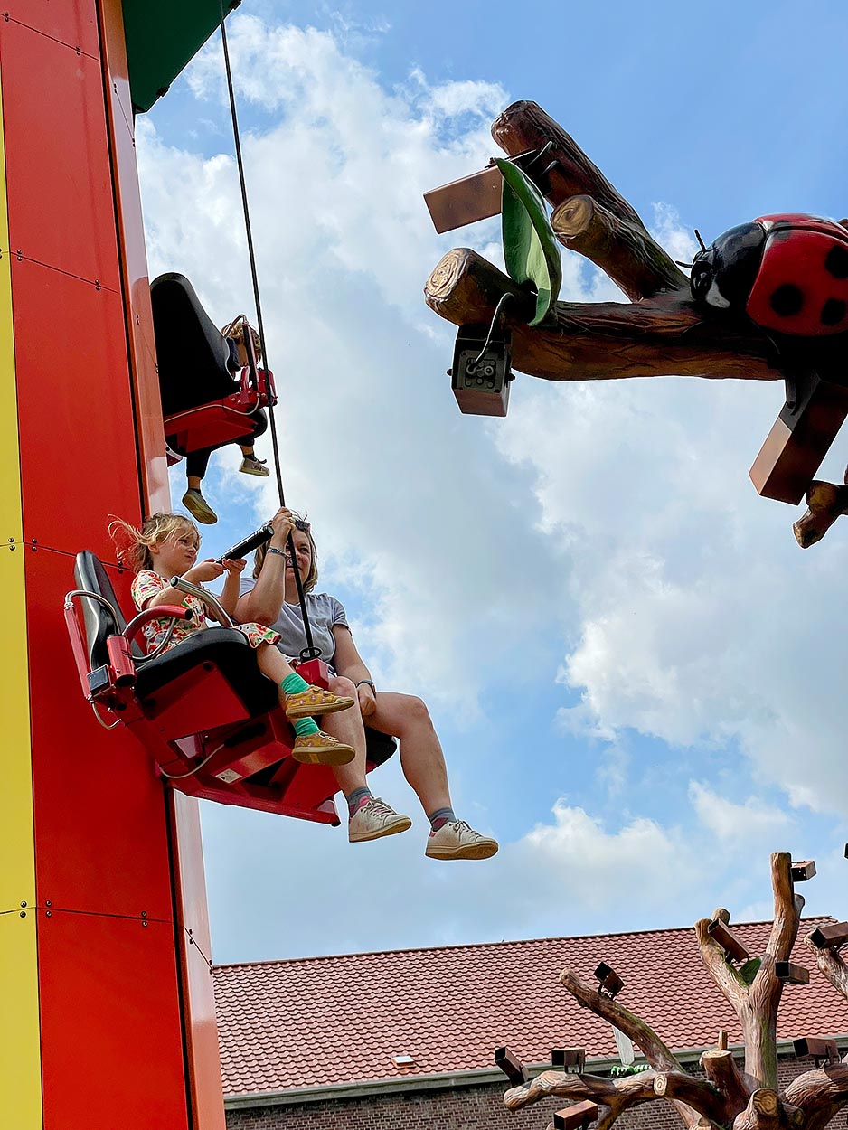Het park is vooral gericht op kleine kinderen – tot pakweg een jaar of 12 – en staat vol typisch Duitse attracties. Veel van die attracties kan je zelf bedienen, wat het ook voor ouders superleuk maakt. Zo was er uiteraard de typische Nautic Jet, een bootje dat achteruit een schans wordt op getrokken, dan lost, je vooruit katapulteert zodat je op het water splasht. Er was ook een superleuke kinderversie waarbij iemand moet fietsen om het bootje omhoog te trekken. Ellis wou wel tien keer. Nog een keer! Nog eens! Goeie fitness voor ons. Een andere attractie is een kooi die heel hoog heen en weer schommelt (waar ik doodsangsten in uitstond), maar waar Robin en Ellis nog 2 keer in gingen. Er was ook een heel klein zelfbedienings-kinderachtbaantje dat we ook al in andere parken hadden gezien. Pret pret pret!